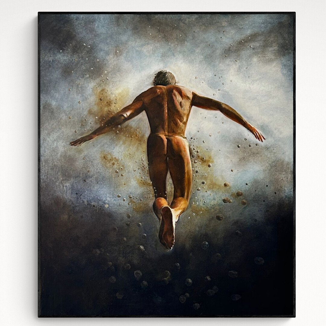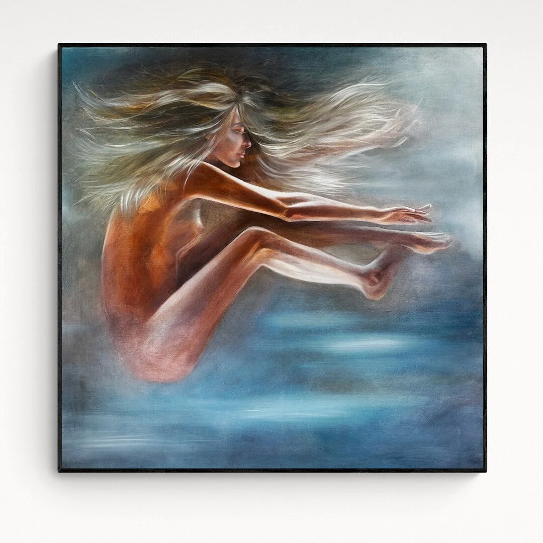Her art ignites a sense of wonder, prompting viewers to dive into the unexplored and break free from the everyday. To float in weightlessness in her paintings is depicted not merely as a physical state but as an act of faith – a trust in the cosmic embrace, reminiscent of a parent catching a child in mid-air. The figures in "Gravity" exude a deep-seated faith in this force, indulging in the liberating joy of their authentic selves. Anna invites us into an odyssey of self-discovery, where imagination's frontiers are exceeded, and the allure of the unknown is unveiled in all its glory.